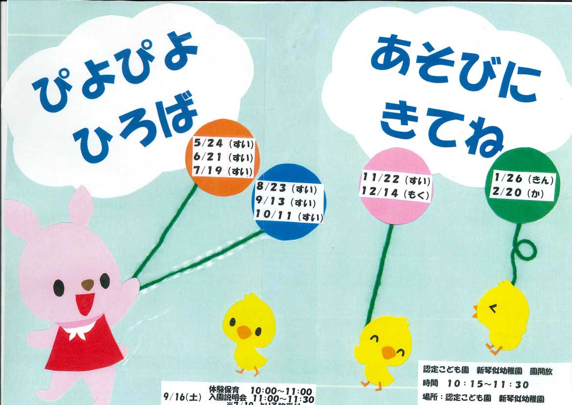 当日はホール横「にじ玄関」よりお入りください。受付をして、ホール・うさぎるーむ・園庭で遊ぶことが出来ます。予約は不要、参加費は無料です。定員は特にありません。
