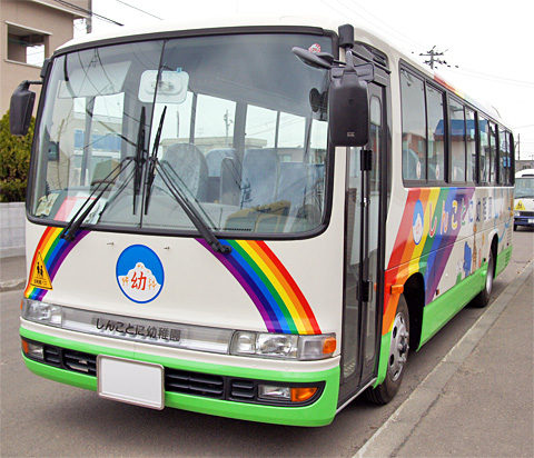 幼稚園には3台のバスがあります。虹と緑の大きな1号車、黄いかわいい2号車、青いスカートの3号車です。