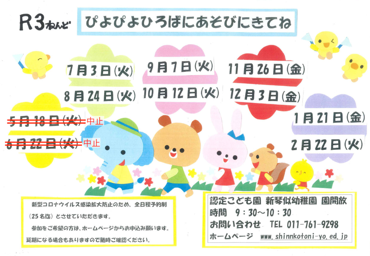 ■今年度のぴよぴよひろばは、感染症拡大予防の為、各回定員25名の予約制とさせていただきます。参加者保護者は1名でお願いします。また、新型コロナ感染状況により中止となる場合がありますので、ご了承願います。随時ホームページにてお知らせいたしますので、ご確認をお願いいたします。