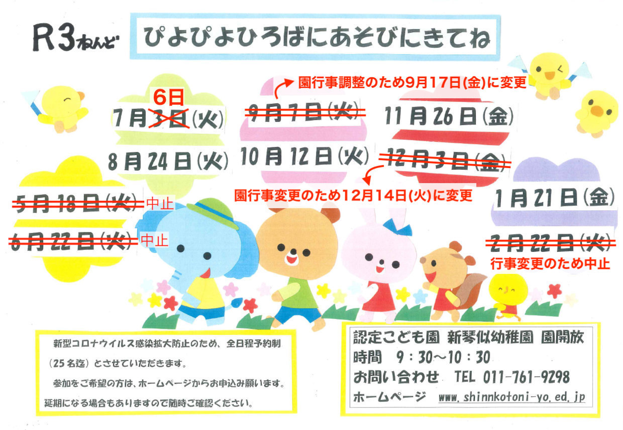 ■今年度のぴよぴよひろばは、感染症拡大予防の為、各回定員25名の予約制とさせていただきます。参加者保護者は1名でお願いします。また、新型コロナ感染状況により中止となる場合がありますので、ご了承願います。随時ホームページにてお知らせいたしますので、ご確認をお願いいたします。