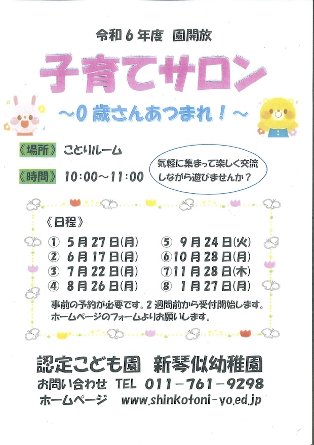 令和6年度の園開放スケジュールです。開催2週間前にホームページフォームより受付を開始します。親子で遊びに来てみませんか?